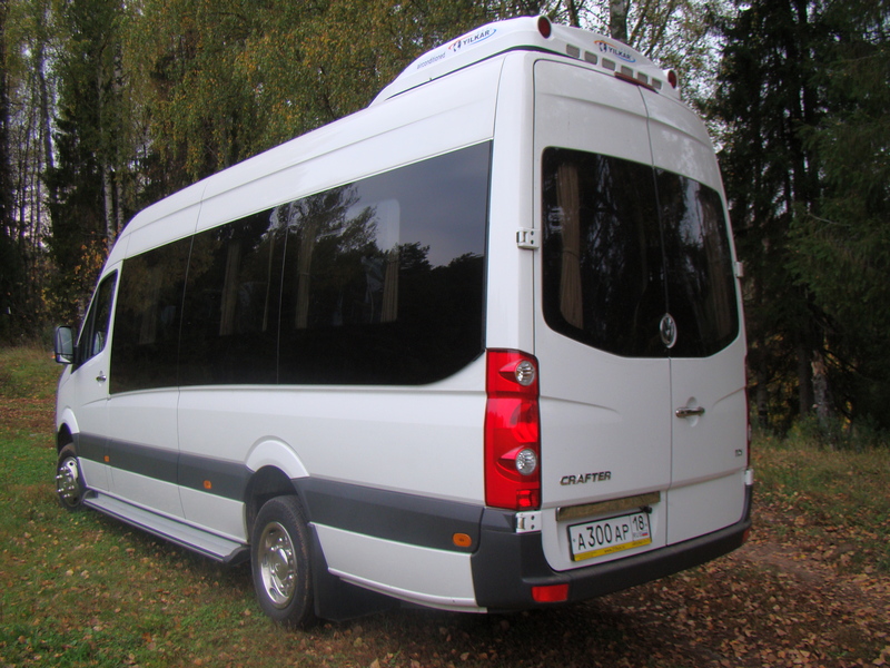 "Volkswagen Crafter"(цвет белый, салон Турист-ЛЮКС, ТВ 22", розетка 220 В, удобные сиденья с откидывающейся спинкой и ремнями безопасности, вместительное багажное отделение, кондиционер, 2 независимых отопителя в салоне),