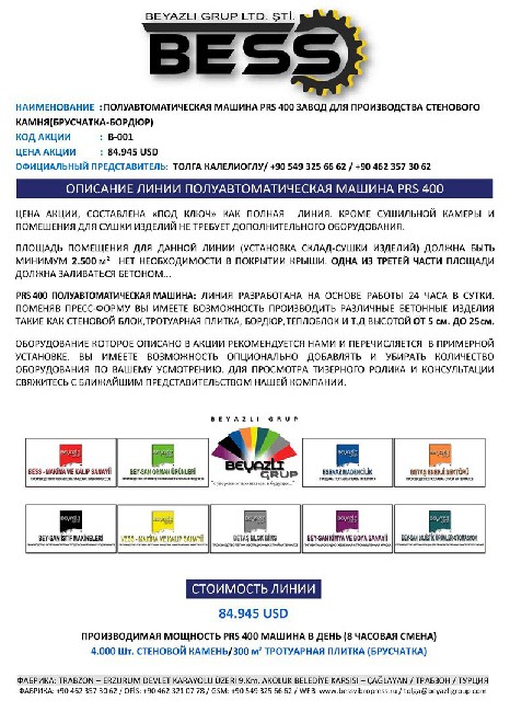 ПОЛУАВТОМАТИЧЕСКАЯ МАШИНА PRS 400 ЗАВОД ДЛЯ ПРОИЗВОДСТВА СТЕНОВОГО КАМНЯ ОБОРУДОВАНИЕ КОТОРОЕ ОПИСАНО В НАШЕЙ АКЦИИ РЕКОМЕНДУЕТСЯ НАМИ И ПЕРЕЧИСЛЯЕТСЯ В ПРИМЕРНОЙ УСТАНОВКЕ. ВЫ ИМЕЕТЕ ВОЗМОЖНОСТЬ ОПЦИОНАЛЬНО ДОБАВЛЯТЬ И УБИРАТЬ КОЛИЧЕСТВО ОБОРУДОВАНИЯ ПО ВАШЕМУ УСМОТРЕНИЮ. ДЛЯ ПРОСМОТРА ТИЗЕРНОГО РОЛИКА И КОНСУЛЬТАЦИИ СВЯЖИТЕСЬ С БЛИЖАЙШИМ ПРЕДСТАВИТЕЛЬСТВОМ НАШЕЙ КОМПАНИИ.