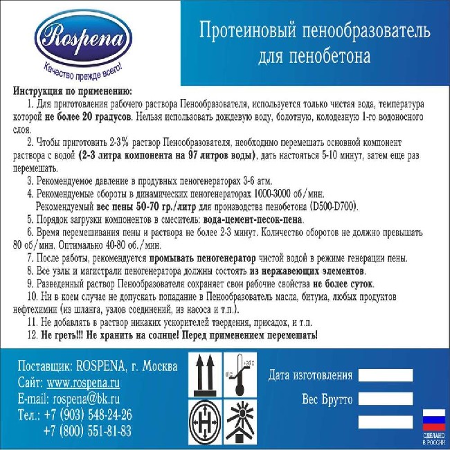 Предлагаем европейского качества белковый - протеиновый, пенообразователь для пенобетона Rospena.