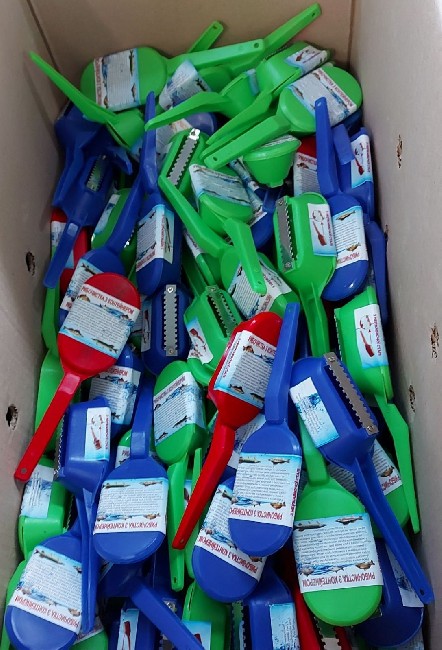 - различную кухонную продукцию (терки для нарезки овощей, фруктов; корейка для нарезки моркови; ножи для нарезки пиццы, тортов, фруктов, овощей; нож для очистки рыбы от чешуи; шумовки; шинковки; сливная крышка; нож формировочный для фигурной нарезки картофеля (для чипсов); ковши для ёмкости; рыбочистка с контейнером и др.) Вся продукция из качественной нержавеющей стали и качественной пластмассы.