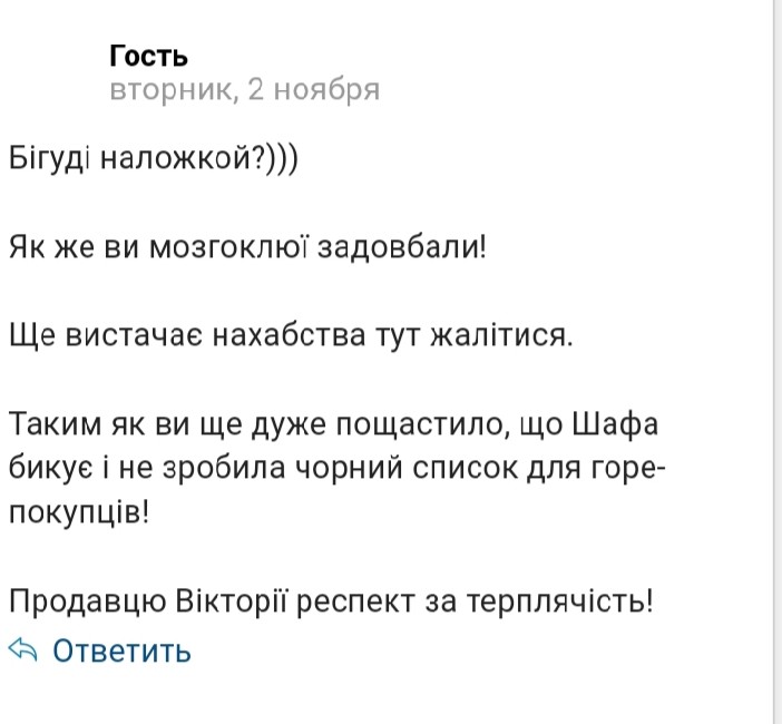 Сайт Шафа свалка с украинскими независимыми Дешевками сошедшими с ума от зависти, нищеты и голода.Виктория Павлоград 0958205415 продавец -Неадекват с которой не стоит связыватся,психически больной человек требующая лечение в наркодиспансере. Когда особи шизофренички отделяются от сущности, они обкурившись начинают бунтовать предьявляя всем претензии, не находя их в себе.Сидя в мусоробаке летая в своей Галактике продавец забывает о том, что договаривается с покупателями по телефону выслать товар наложкой, видео или фото товара, сделать скидку,перезвонить после работы и уточнить адрес.Обижатся не стоит,смеятся грех,стоит лишь соболезновать 200 отзывам саморекламы с Дурдома"Солнышко". Виктория г.Черкассы.