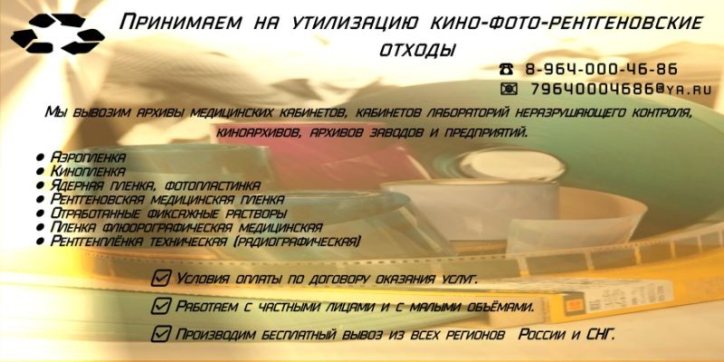 Мы вывозим кино-фото-рентгеновских отходов и снимков всех категорий: архивы медицинских кабинетов, кабинетов лабораторий неразрушающего контроля, киноархивов, архивов заводов и предприятий, заключаем договора как с юридическими, так и с физическими лицами.