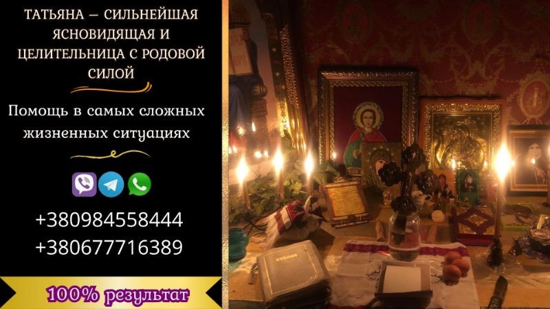 Вы ищете помощи в решении жизненных проблем? Устали от невезения,  конфликтов или страха за будущее? Ясновидящая и целительница Татьяна с родовой силой готова помочь вам изменить свою жизнь.  Сотни людей уже обрели счастье и гармонию благодаря её знаниям и магии четырех стихий:  Огня,  Воды,  Воздуха и Земли.