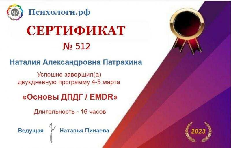 Меня зовут Наталия,  и я — профессиональный психолог с опытом работы в самых разных направлениях.  НЛП-практик и мастер,  кризисный психолог,  EMDR-терапевт,  гипнолог,  специалист по нейрографике.