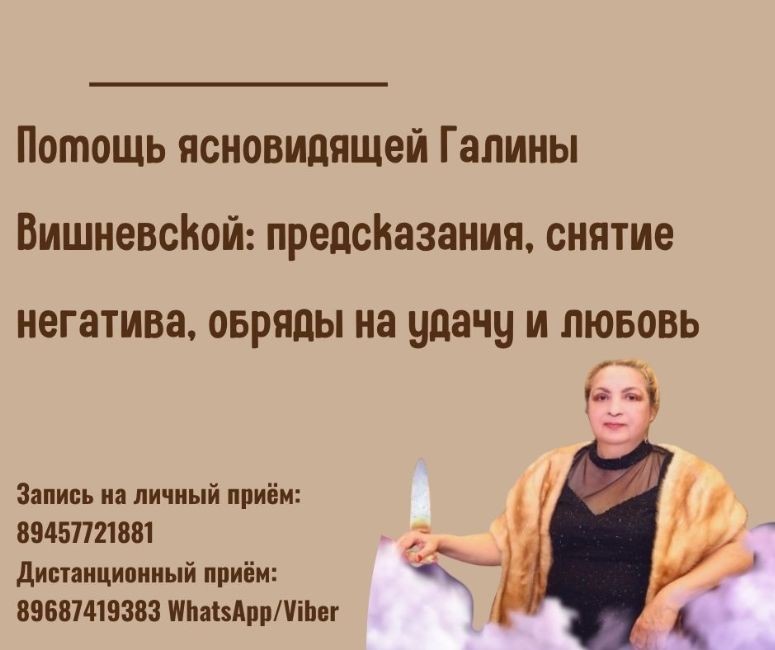 Не откладывайте своё счастье на потом. Обратитесь к Галине Вишневской уже сегодня и позвольте ей помочь вам изменить судьбу.