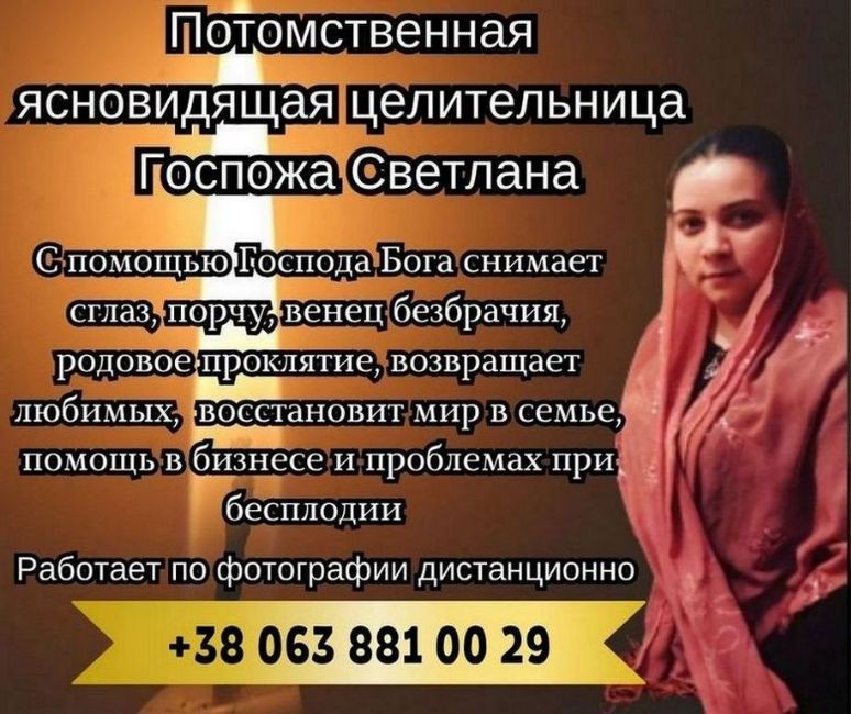 Вы устали от череды неудач? Чувствуете на себе влияние сглаза или порчи? Любимый человек отдалился, а отношения рушатся? Светлана, потомственная ясновидящая с многолетним опытом, поможет вернуть гармонию, снять негатив и привлечь в вашу жизнь удачу и счастье.