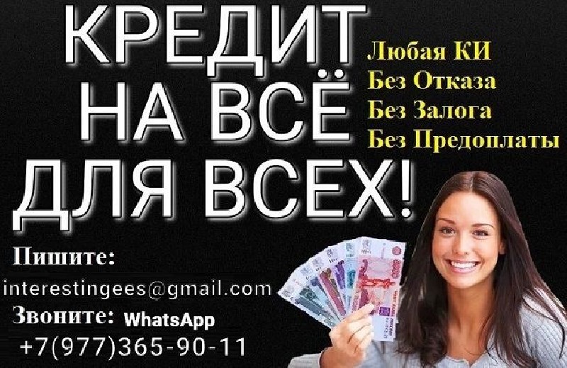 Кредит на любые цели без предоставления справок с работы и подтверждения занятости. Предоставляем гарантии, которые другие кредиторы предоставить не могут. Работаем с должниками и лицами с проблемной кредитной историей. Помогаем должникам, неофициально трудоустроенным, за кредитованным. Суммы до 5 миллионов рублей без залога и поручителей гражданам Российской Федерации, в возрасте от 18-70 лет. Регион проживания значения не имеет. Решение всех финансовых проблем уже сегодня. По всем интересующим вопросам пишите нам на эл. почту interestingees@gmail. com, по телефону или WhatsApp +7(977)365-90-11