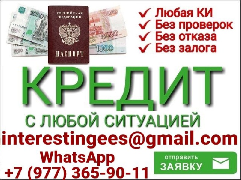 Все регионы и города! Поможем оформить и получить кредит без лишних вопросов, справок с работы и поручителей. Без дополнительных документов и платных услуг. Есть возможность помочь людям с плохой кредитной историей, просрочками и различными долгами. Предоставляем гарантии, которые не могут предоставить другие. Решение всех финансовых проблем уже сегодня! Получение кредита в удобном для Вас отделении, с подписанием всех необходимых документов. Заявки принимаем на эл. почту interestingees@gmail. com или WhatsApp +7 (977) 365-90-11