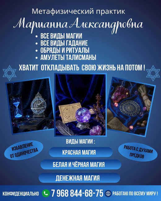 Вы запутались в жизненных неурядицах? Чувствуете, что сбились с пути? Метафизический практик Марианна Александровна поможет вам обрести уверенность, найти ответы на волнующие вопросы и наладить все сферы жизни.
